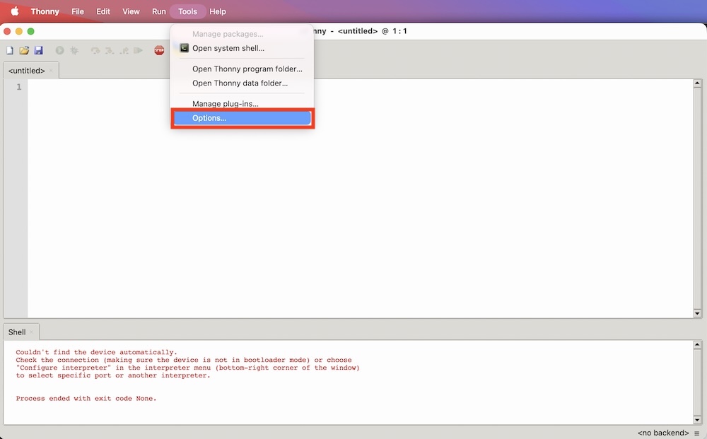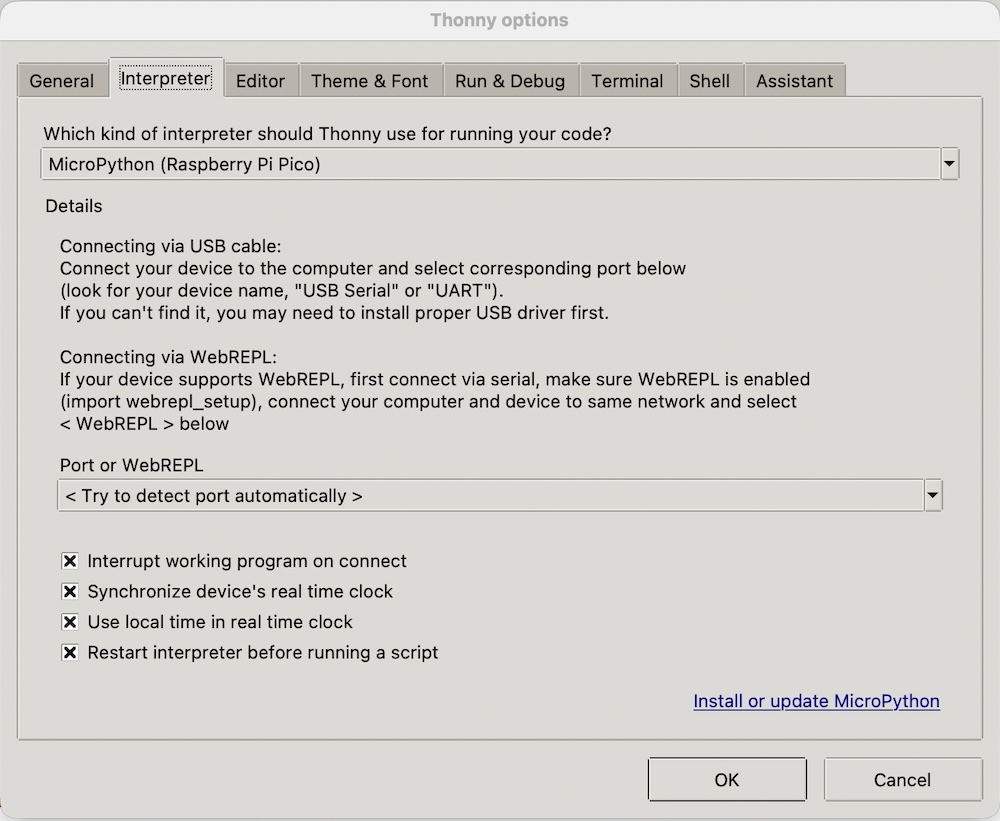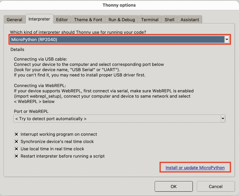 Set the “Which kind of interpreter should Thonny use for running your code?” section to “MicroPython (RP2040)”. Leave the “Port or WebREPL” section as “Try to detect port automatically”.