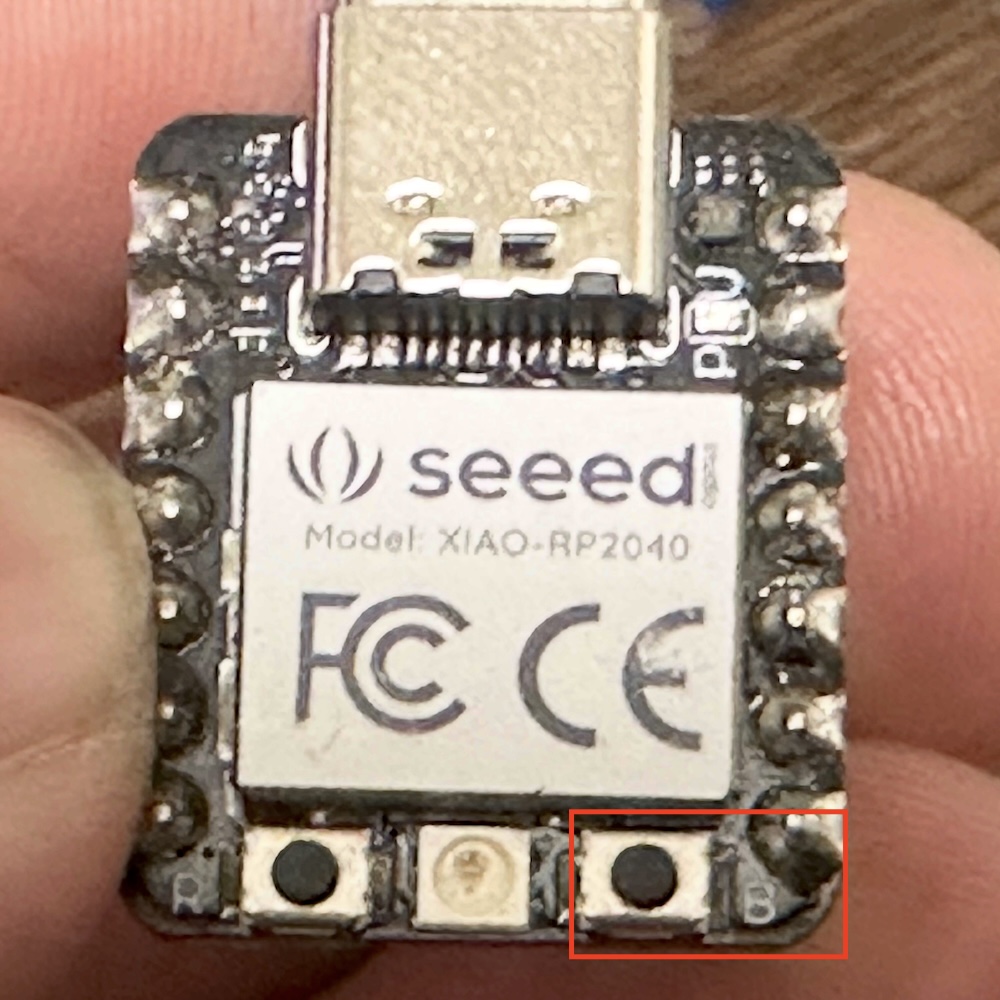 Next, connect the RP2040-based dev board to your PC. Crucially, press the dev board’s BOOT button while connecting. This ensures the PC recognizes it as a USB device capable of receiving program writes. The following image shows the location of the BOOT button on the XIAO RP2040.