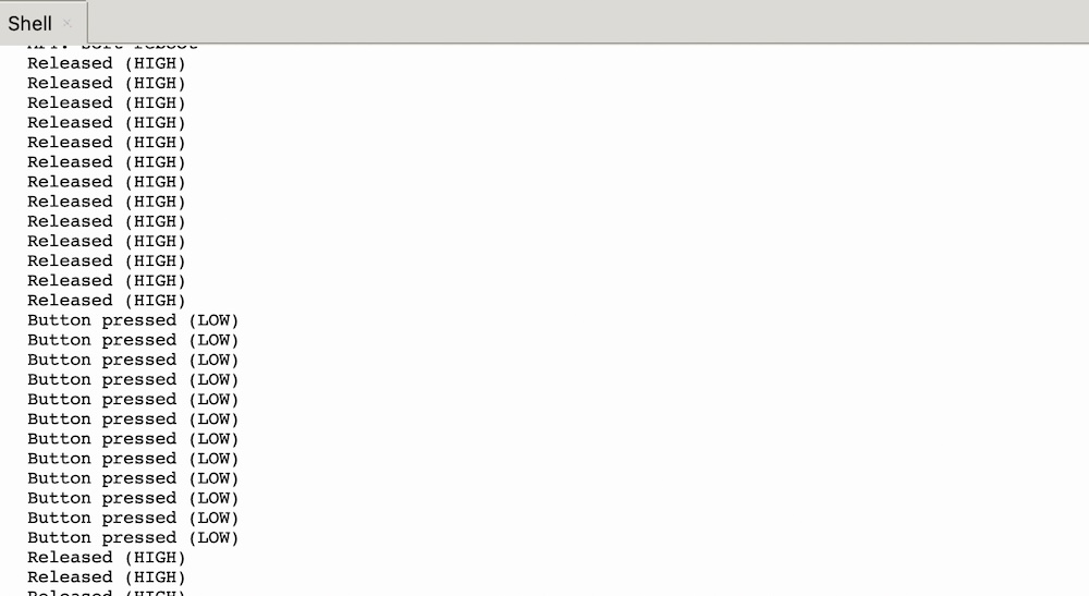 When executed, the button state is output to the serial monitor as follows. When the button is pressed, the read value is 0 (LOW). When the button is not pressed, the read value is 1 (HIGH).