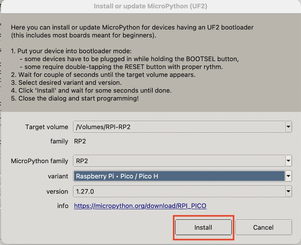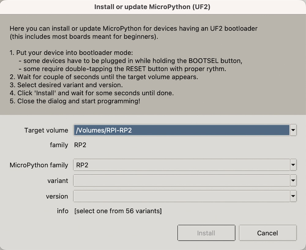 The “Install or update MicroPython (UF2)” dialog will appear. If you connected the XIAO RP2040 to your PC as described earlier, the Target Volume will display as /Volume/RPI-RP2, as shown below.
