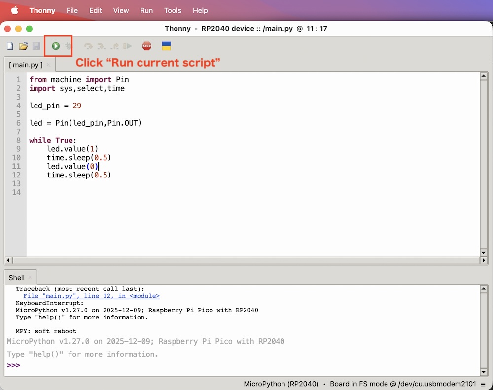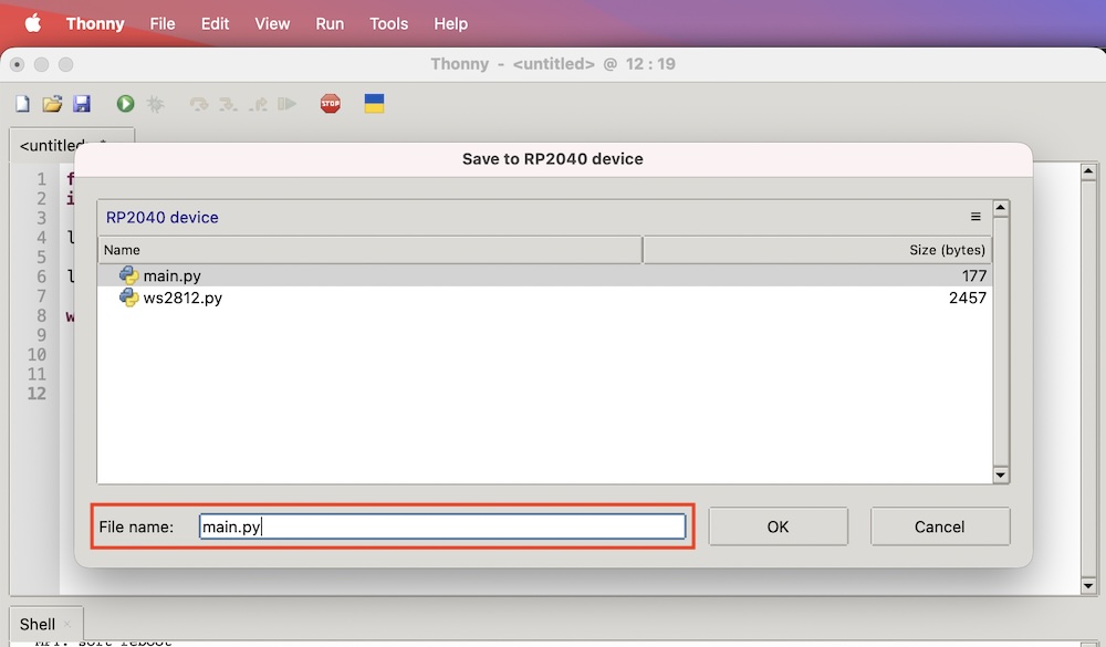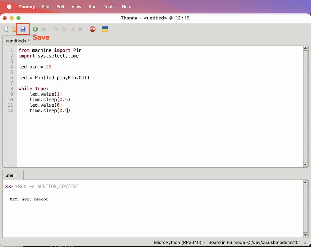 Save the file as “main.py”. This allows the microcontroller program to run when power is supplied, even if the Thonny editor is not open.
