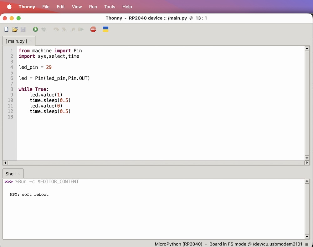 While writing a program to blink the LED connected to pin P29 on the dev board, I’ll explain how to write programs in MicroPython. First, here’s the entire code: