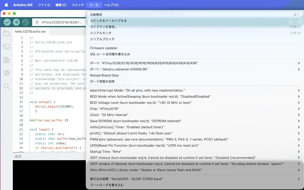 From the Embedded Programming course page, download the echo.ino file located in the ATTiny3216 section and open it in the Arduino IDE.