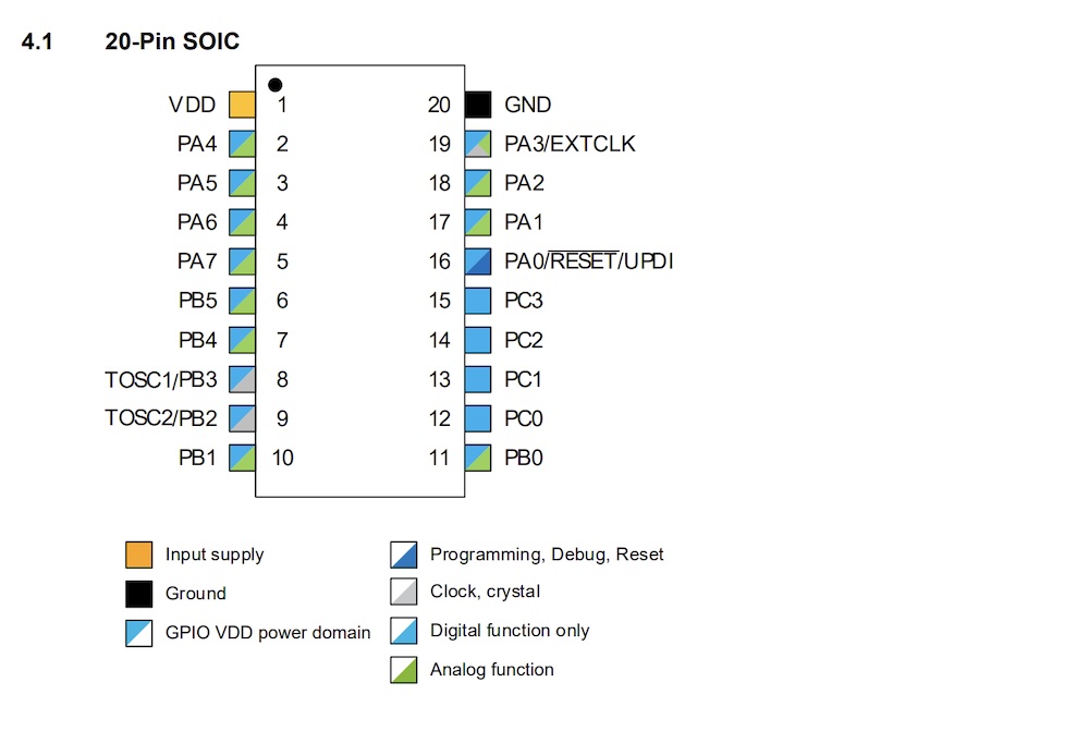 Here, we’ll check the Pin Assignments in the datasheet. The datasheet states the following: Of the 20 pins, the top-left pin is VDD (where you input power), and the top-right pin is GND. PA0 is the UPDI write pin. PB3/PB2 are digital function only, while all other pins can be used for both digital and analog functions.