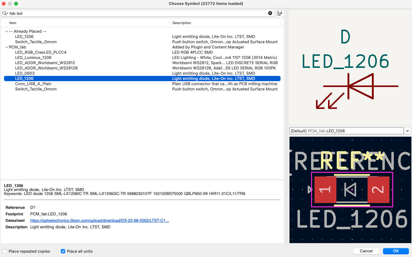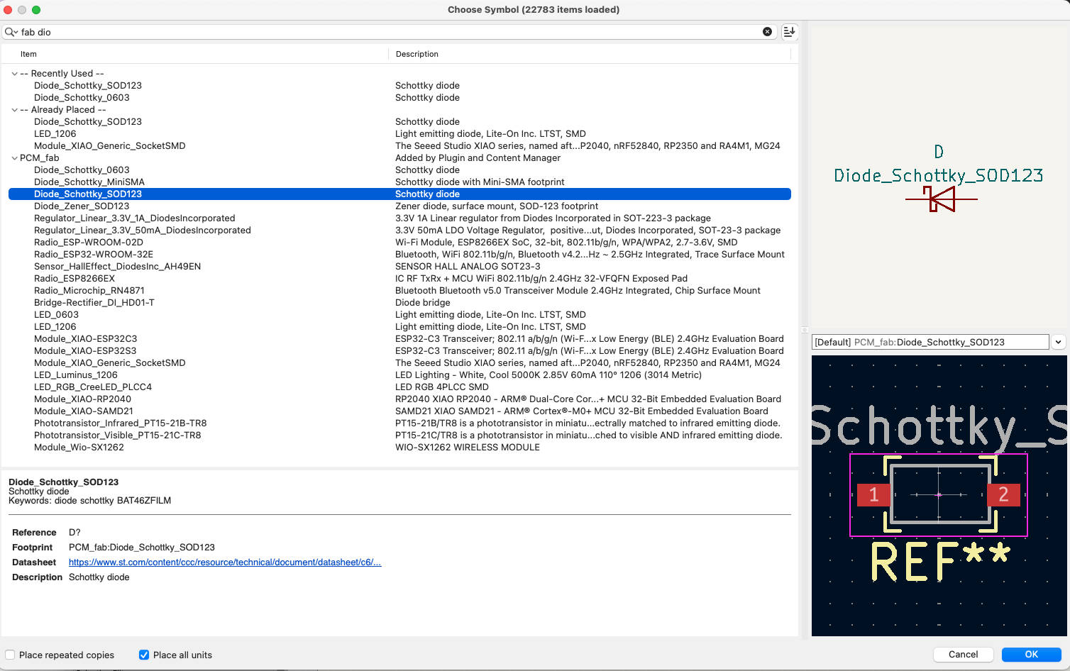 Select shotkey diode. Currently there is the diode in the Fablab Kamakura inventory. So select the “SOD123”.
