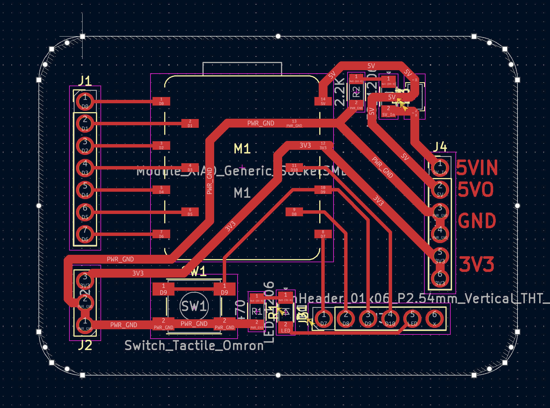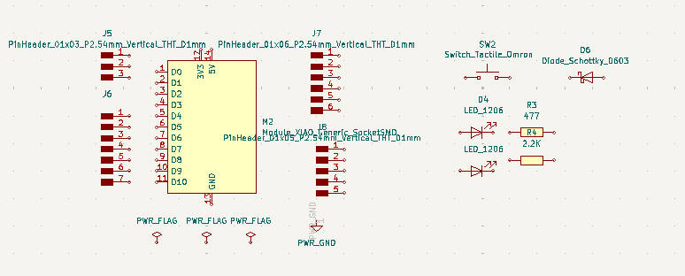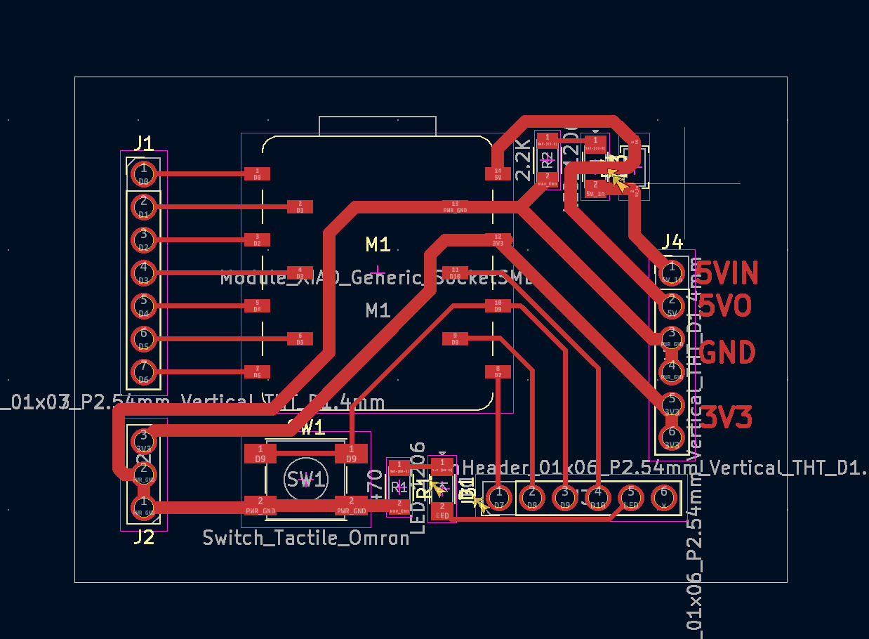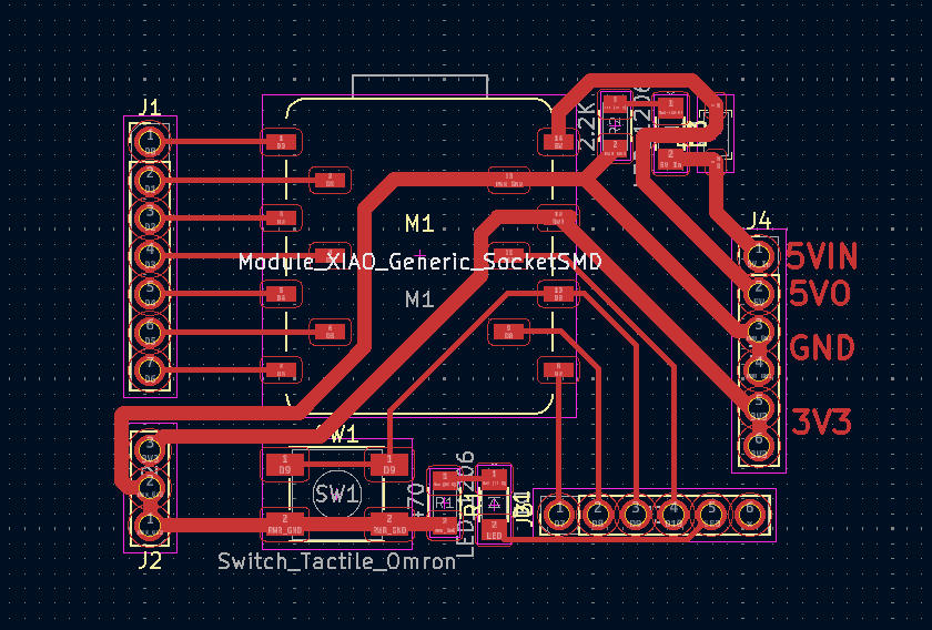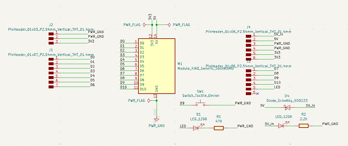 The 5V pin on the XIAO is VBUS, which can be used as either an input or output. It is routed to two separate header pins: one for input and one for output. A Schottky diode is added on the input side to prevent reverse current. A power indicator LED is connected in parallel to the 5V input line. A large resistor value is used to limit the current so that it does not affect the main circuit.