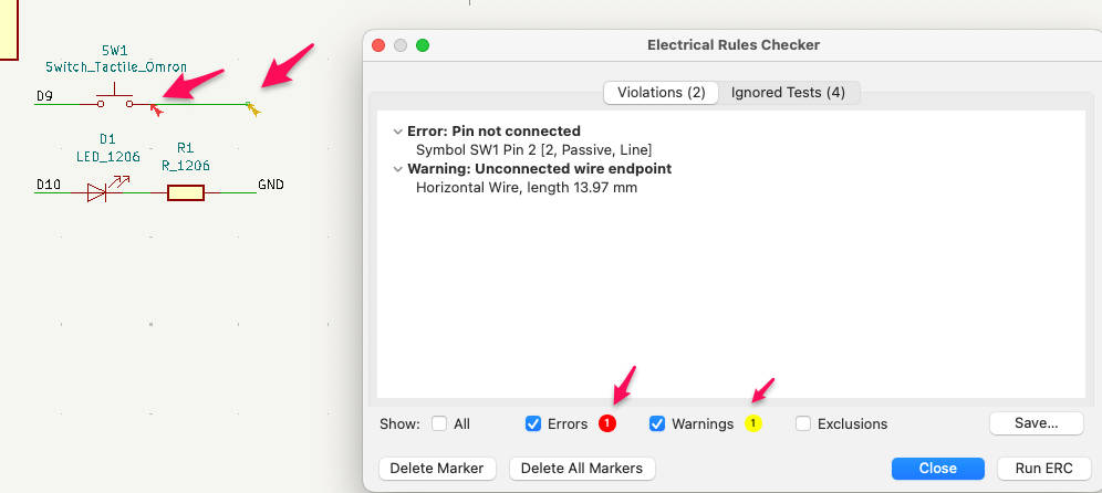 The example shows an error and an warning. The wire from the tactile switch is currently open.