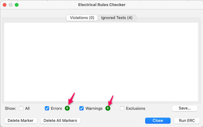 The example below shows a case with 0 errors and 4 warnings. The warnings indicate that some silkscreen reference labels are overlapping. Since we are not printing component reference names on this board, these warnings can be ignored.