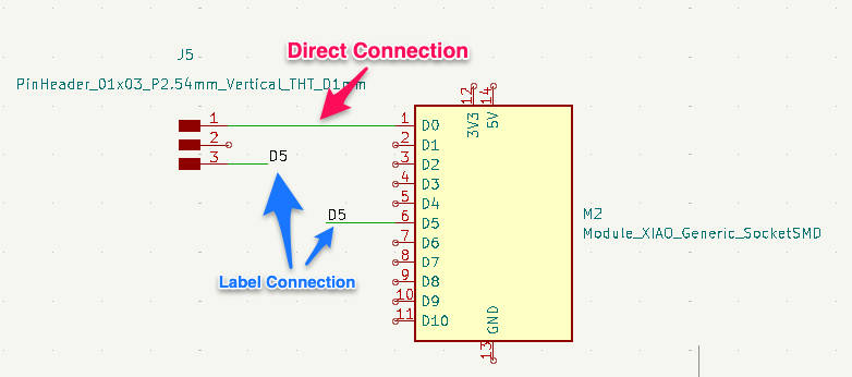 Place the same net label on multiple wires, and KiCad will treat them as electrically connected, even if no physical wire is drawn between them.