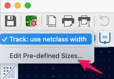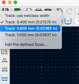 To use a different trace width, select the desired width from the Width menu in the top-left corner of the screen, then start routing. After finishing, switch back to Track: use netclass width.