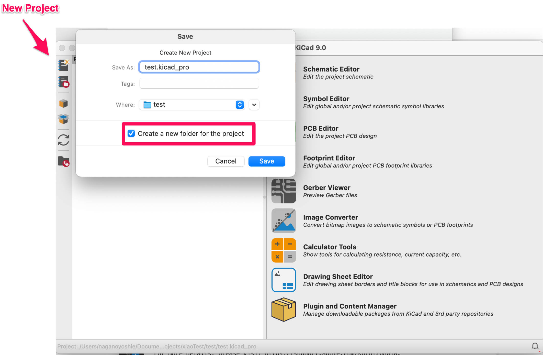 Push the ” new project” icon, or File > New Project. Enter a project name. It will create .kicad_sch(for a schematic) and .kicad_pcb(for a board design) files.