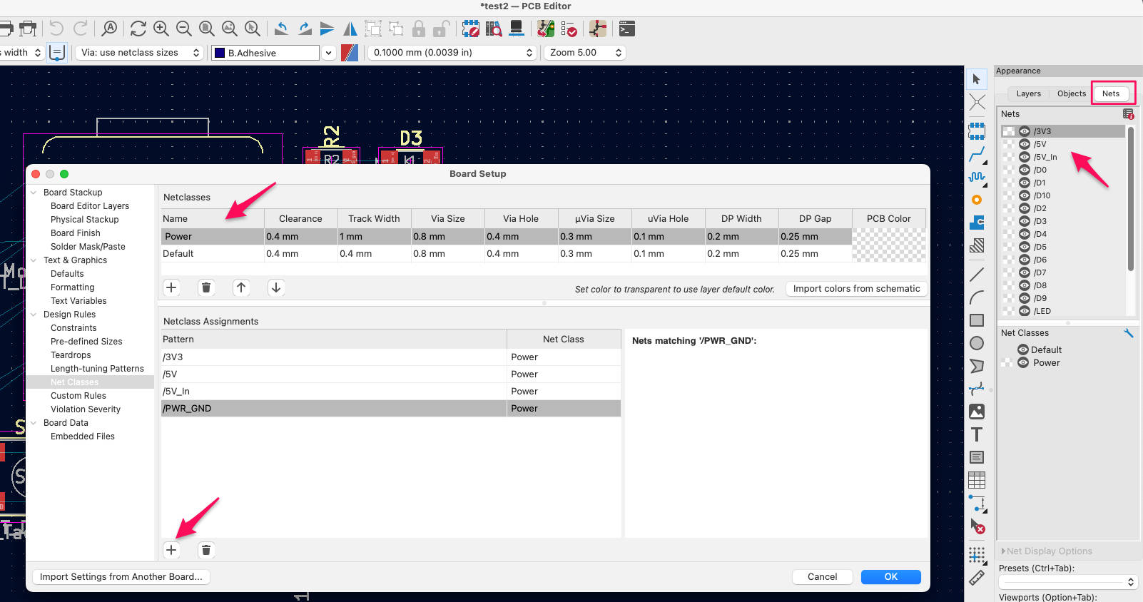 Check the net names in the Nets tab on the right. Assign the power-related nets to the Power class in Netclass Assignments. Once assigned, the defined rules (such as trace width) will be automatically applied during routing.