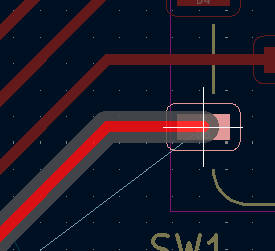 KiCad will automatically generate a routing path between the two pads. The red line represents the copper trace. The gray area on both sides indicates the clearance.