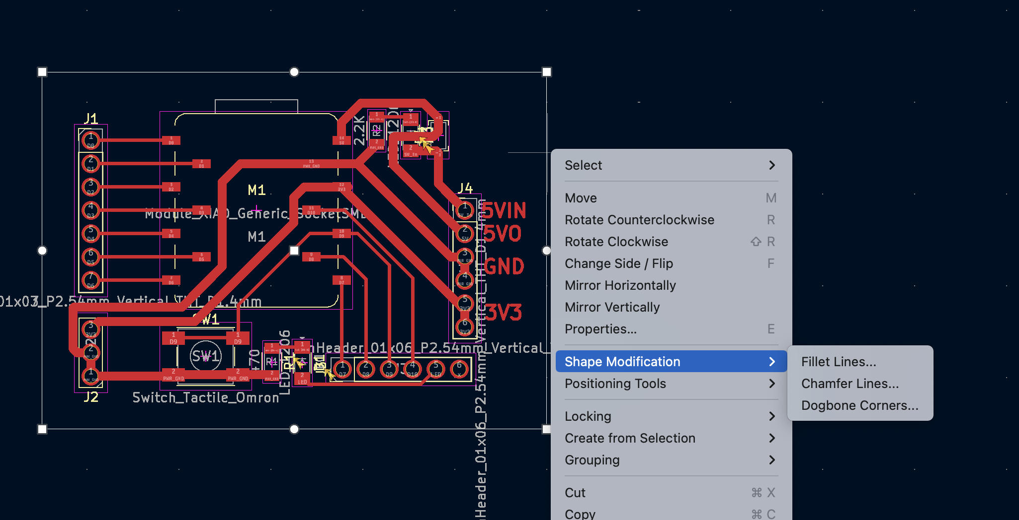 To fillet a corner of the board outline, right-click on the line segment and select Fillet.