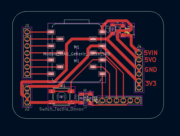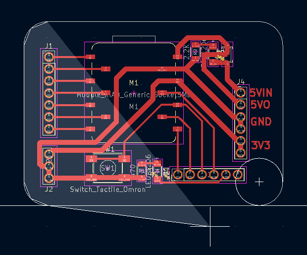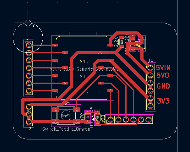 To meet the assignment requirements, a tactile switch is connected to D9. The pin is intended to use the internal pull-up resistor in the code, so no external resistor is added. D9 is also routed to a pin header in parallel. If the switch is not used, the pin remains open and can be used for other purposes.