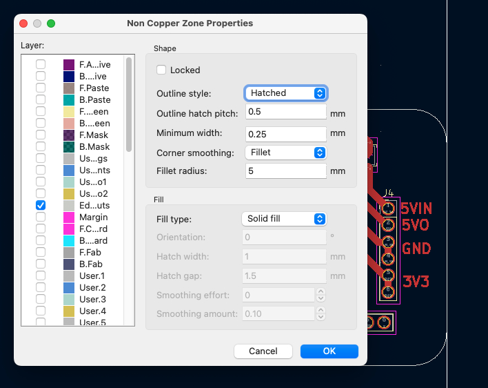 - Select F.Cu and Edge.Cuts layers. And set parameters.