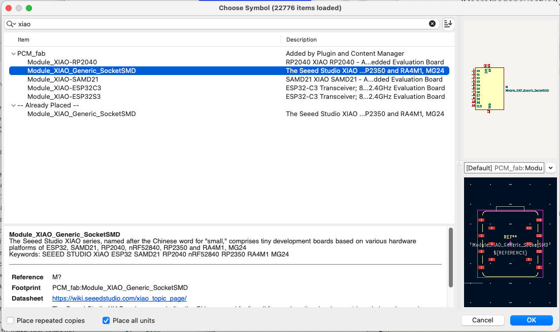 Search xiao, then select socket. Press OK and place it (click) on your schematic sheet.