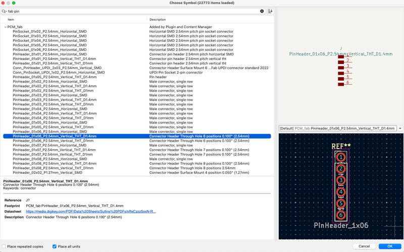 Select necessary pin headers or sockets in the fab library.