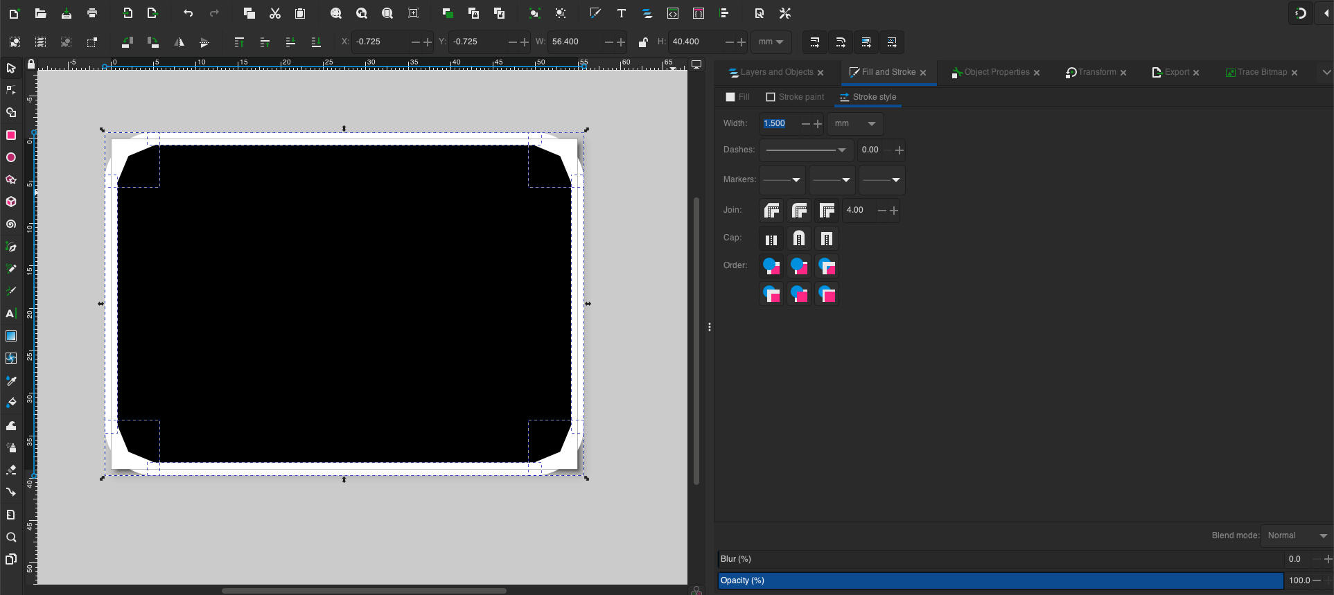 Select the Fill and Stroke tab > Stroke style. Change the Stroke width to 1.5mm.