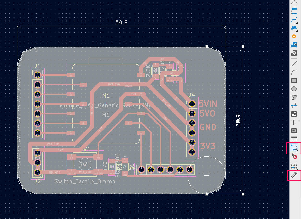 Use the Measure Tool or the Dimension Tool to verify the board dimensions before fabrication. Click the two points you want to measure.